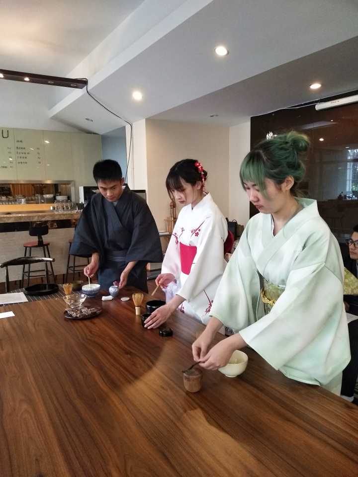 接下来,穿着和服的同学们围坐在青柳先生周围,倾听青柳先生对茶道的讲解。日本的茶道源自中国,在漫长的历史演变中,形成了独自的特色。茶道器具,朴素简约,简朴中凝结了崇高的智慧。青柳先生首先示范,一招一式,不慌不忙,稳重淡定。他说,何以如此?因为茶道旨在“一期一会”,不论地位高低,唯平等饮之,回归人心平静,不被世间纷乱搅扰。“一期一会”乃日本仿中国成语自创词汇,始创于日本茶道始祖千利休,是日本茶道思想之精髓。意指人的一生,彼此相见,只此一遭,清茶一杯,珍惜缘分,善待彼方。惟其如此,饮茶虽为日常行为,但却极富宗教、哲学、伦理和美学思想,故为“茶道”。