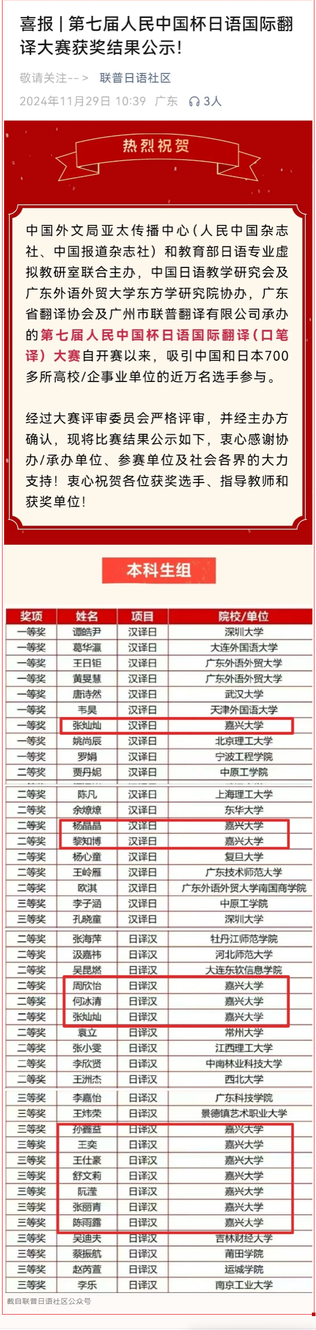日语专业学子在2024年第七届“人民中国杯”日语国际翻译大赛中再创佳绩!