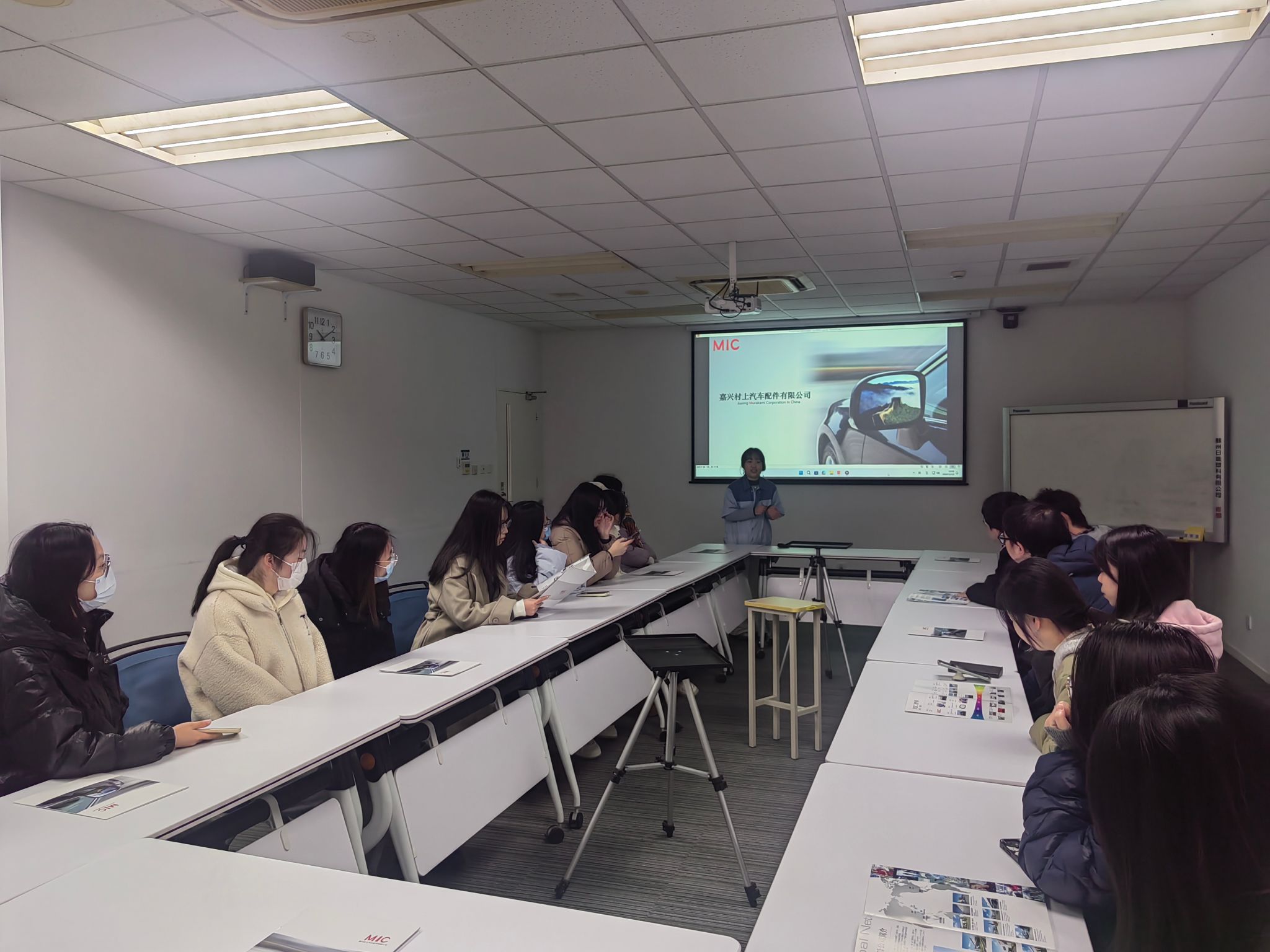 在嘉兴村上汽车配件有限公司人事部王经理和郭经理的热情接待下,同学们参观了公司的注塑成型车间。工作人员详细讲解了汽车配件后视镜的生产流程、技术工艺以及质量控制体系。同学们对现代化的设备和规范化的生产管理留下了深刻印象。