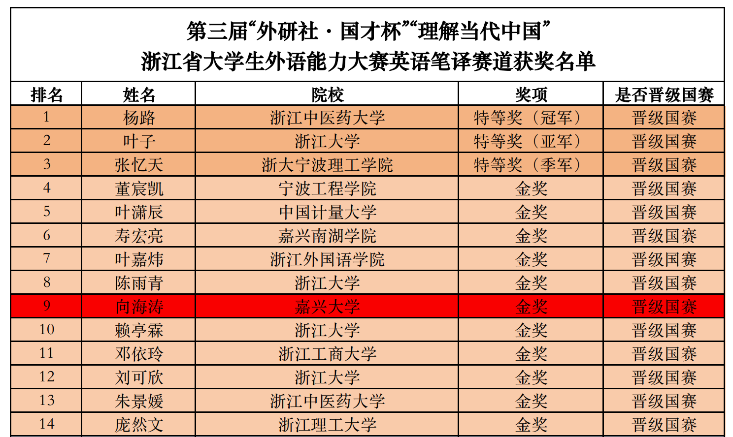 近日,第三届“外研社·国才杯”“理解当代中国”浙江省大学生外语能力大赛英语笔译赛道成绩公布,我院英语专业向海涛同学不负众望,以深厚的专业积淀、敏捷的思维与卓越的笔译能力斩获金奖,入围全国总决赛,刷新了我校在该赛道的最佳战绩!
