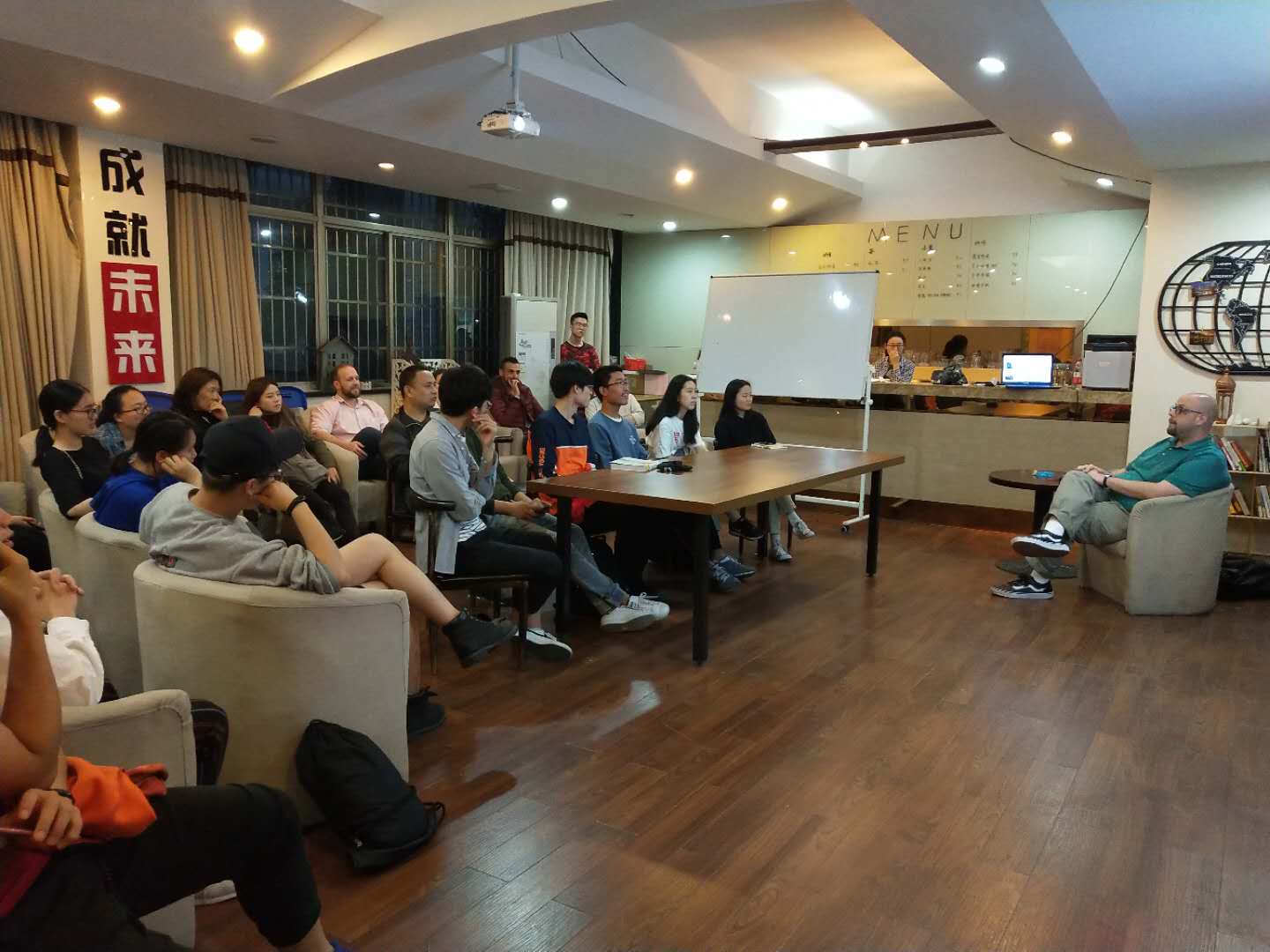 2019年4月18日,本学期第一次中外教沙龙在同人漫画 咖啡吧举行。沙龙主题为Video Game Culture in America(美国游戏文化),主讲人为美籍外教Nathan Tomey。