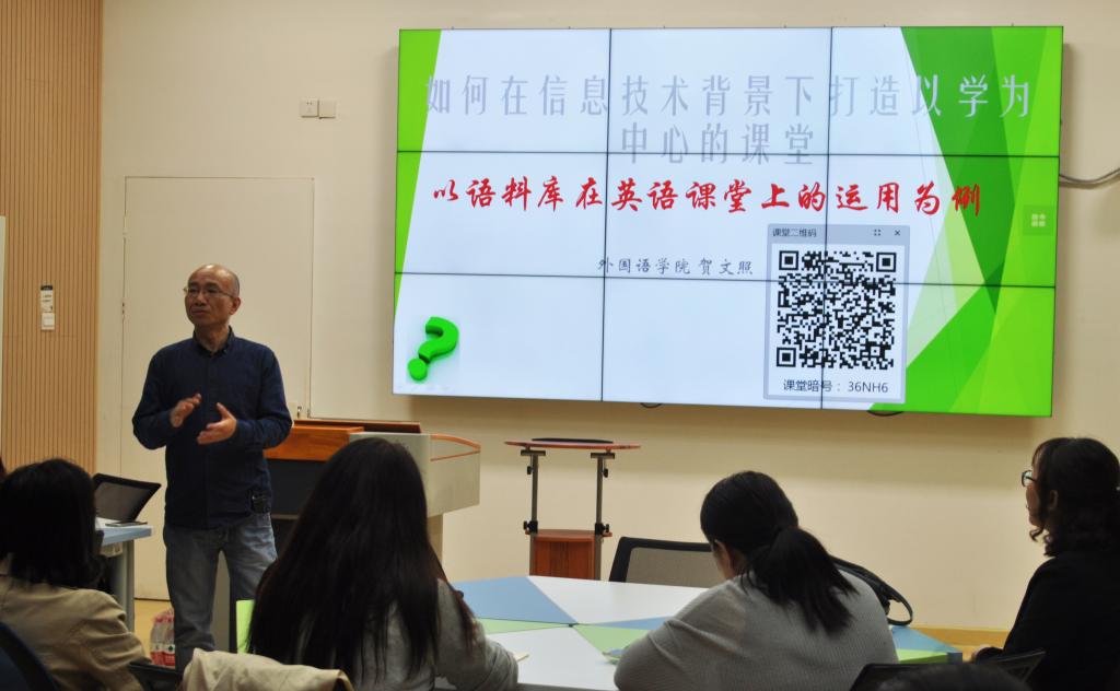 本期教学沙龙由教师发展中心主任徐永良主持,同人漫画 英语系副教授贺文照主讲。贺文照老师根据自己丰富的教学经验,重点为大家介绍了语料库产生的背景、语料库在英语课堂中的运用及注意事项。他指出语料库是以学生为中心的教学理念下信息化的产物,是具有一定规模、经过加工的文本集合。语料库中的语言材料为真实交际活动的产物,具有authenticity。研究发现,语料库应用于语言教学中可以发挥学生的主动性和积极性,提升教育效果。学生通过浸泡在真实的语料中,通过观察语言材料,自己去“发现”规律,得出结论,能更好地培养学主动思考能力和创新创造能力。贺文照老师还通过语法、构词、例证、搭配、区别同义词等多个课堂实例,详细介绍了语料库在英语课堂中的运用。