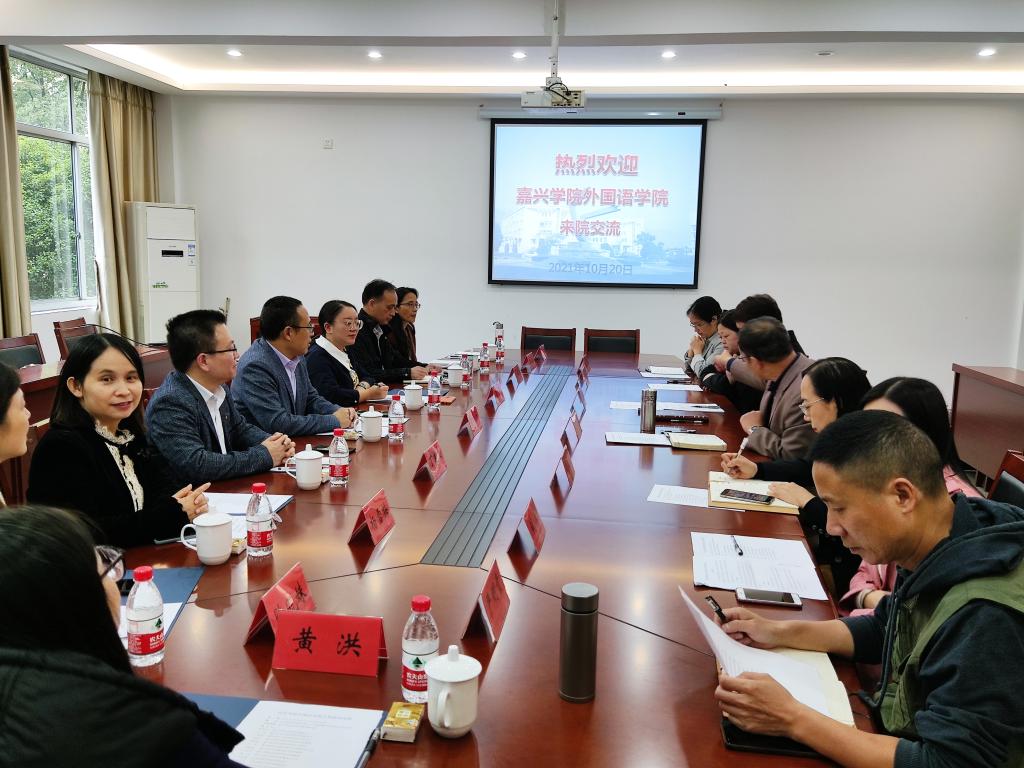 调研得到台州学院同人漫画 热情又隆重的欢迎和接待,台州学院同人漫画 长刘宏照、副院长刘富丽,副院长卢立伟及相关系部和部门主任均出席本次调研活动。首先,在台州学院同人漫画 领导带领下,老师们参观了台州学院同人漫画 教学实践平台、系部办公室、图书室、报告厅、健身房和外语学院文化墙,参观的老师们对跨境电商直播室留下了特别深刻的印象。参观结束后,刘宏照院长和刘富丽副院长先后介绍了台州学院同人漫画 的概况、师资、人才培养、专业建设、课程建设和工作中取得的成就及面临的困难,喻锋平副院长就嘉兴学院同人漫画 以上各个方面的情况和办学特色做了详细的介绍,会上双方进行充分的沟通和交流。此后,两个学院的英语专业、大外部、学工办和教务办相关部门的负责人和老师又进行一对一分组交流,详细、深入和高效地探讨各自关注的内容和问题。