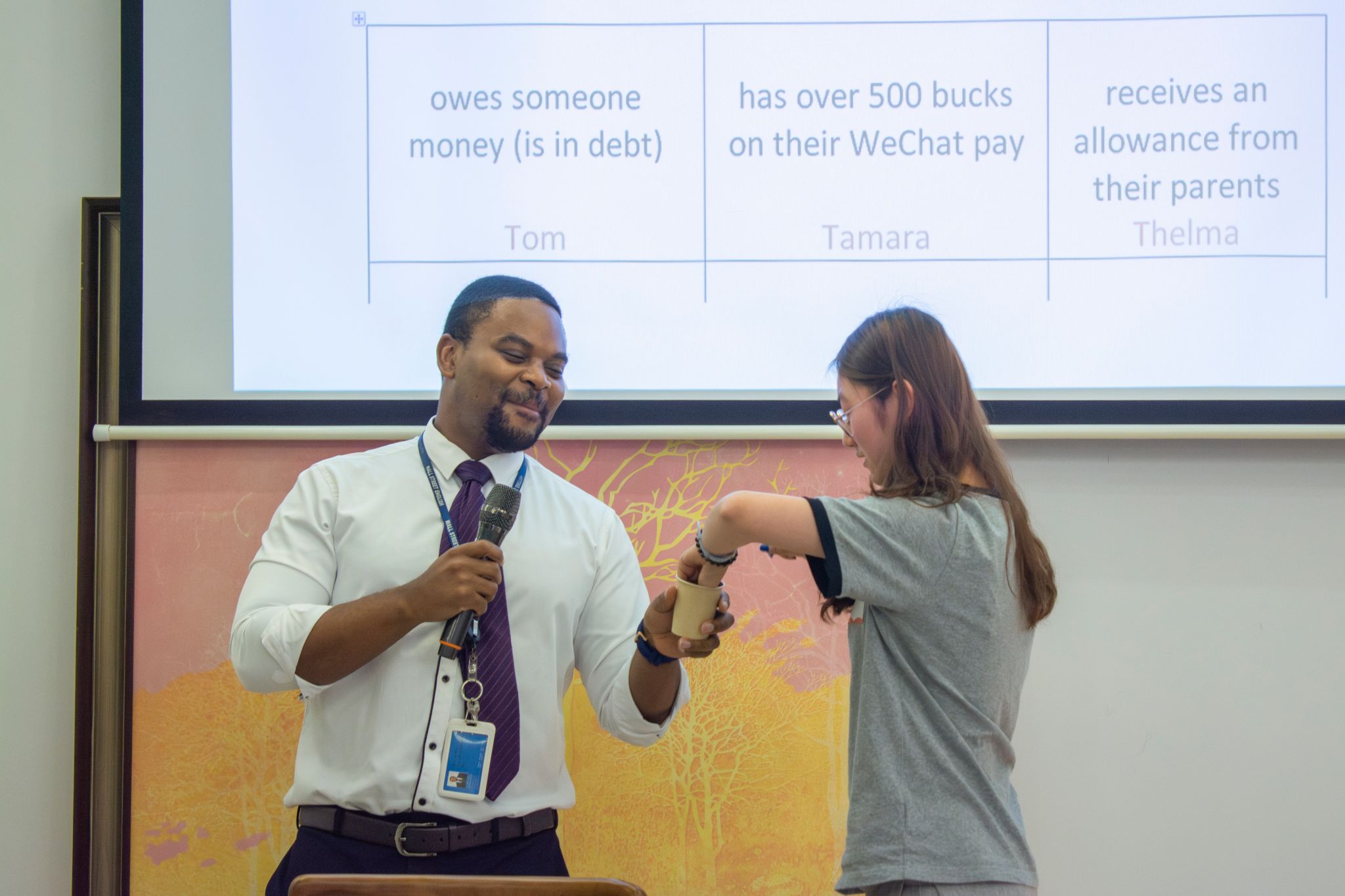 活动伊始,外教Kay以独创的“1 Money Bingo”游戏点燃全场。每位参与者手持写有“buys coffee weekly” “spends money on gaming”等消费习惯的卡片相互提问,陌生感在寻找“消费同好”的过程中悄然消融。随后,Kay让大家体验投资。“”若你手握万元,你会投资黄金、房产、股票、艺术品还是虚拟货币?”随着疫情、地震等事件的轮番上演,同学们手中的资金盈亏剧烈跳动,紧张刺激。