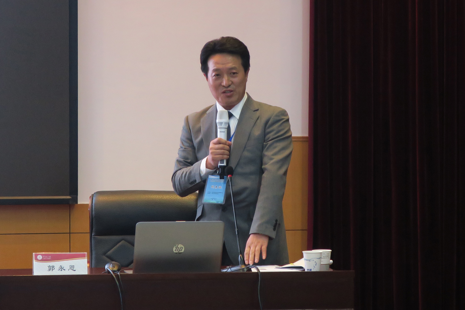 在这次研讨会上,郭永恩老师主持了上海外国语大学许慈惠教授、杭州师范大学王忻教授和浙江工商大学吴玲教授三位老师的基调演讲后,向大会做了题为“打造密切地域发展的日语教育”的报告。