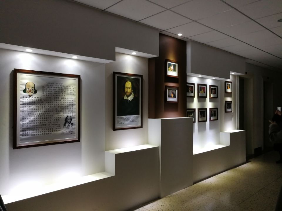 柴院长向交流学习的领导和老师们介绍“莎士比亚”作品长廊