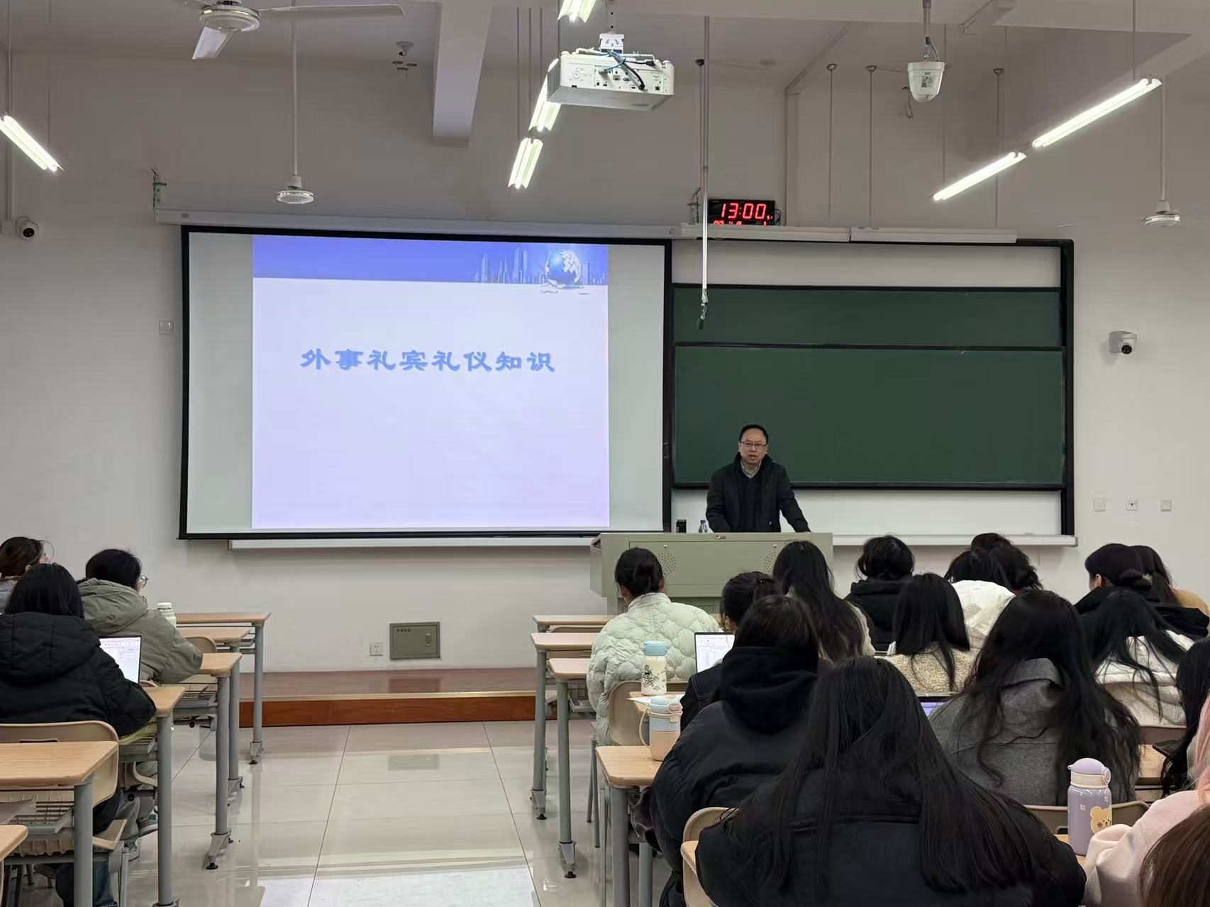 2025年11月28日,浙江省人民政府外事办公室经济与新闻处张汶处长应邀莅临同人漫画 ,为高年级本科生、翻译专业硕士研究生及教师代表五十余人,作题为“外事礼宾礼仪知识”的专题讲座。