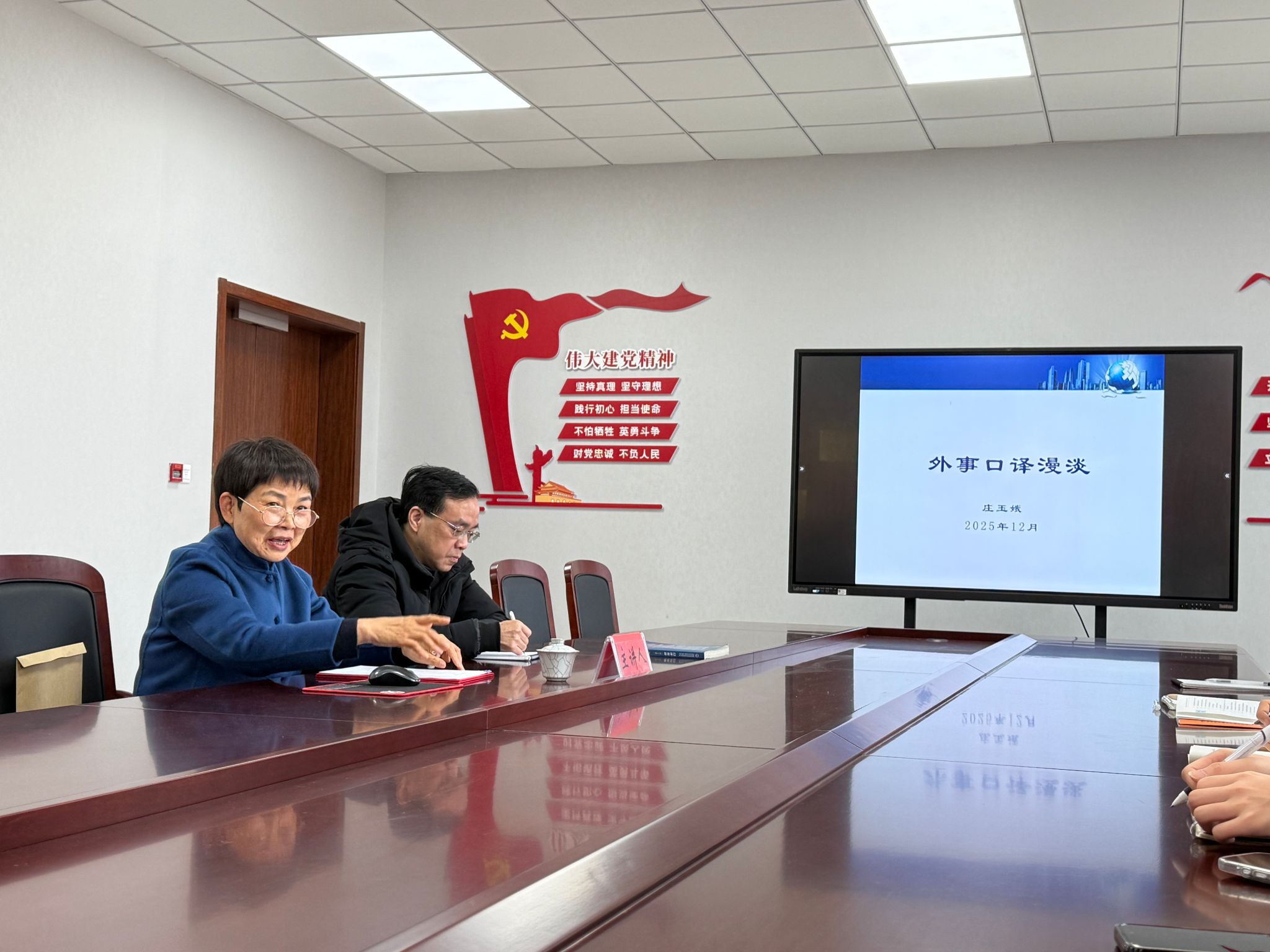 12月30日下午,嘉兴市外事办公室原副主任庄玉娥应邀为同人漫画 2025级翻译专业硕士研究生作题为“外事口译漫谈”的专题讲座。学术副院长单谊教授、翻译硕士生导师肖欢教授及翻译专业硕士研究生等10余人参加。本次讲座由肖欢主持。