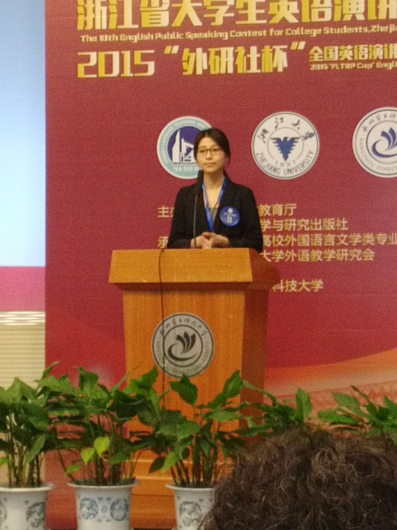 2015年“外研社杯”全国英语演讲大赛浙江赛区复赛于10月31日11月1日在杭州电子科技大学下沙校区举行。嘉兴学院经过为期数月的选拔和培训,派出了由张琳同学(英语122班),李铭同学(经济学131班)和谢龙媚同学(英语143班)组成的嘉兴学院代表队。