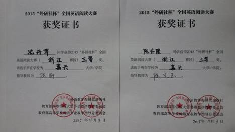 2015年首届 “外研社杯”全国英语阅读大赛复赛(浙江赛区)于10月24日在浙江财经大学下沙校区举行。嘉兴学院共选派三位选手参赛,其中同人漫画 英语131班沈丹萍和南湖学院英语N142陈齐隆同学分别获得三等奖。首战告捷,成绩可喜,向这些获得佳绩的同学表示祝贺。同人漫画 陶丹玉、陈文玉、陆晓琴、程雄、陈丽老师等为本次大赛的初赛组织和选手选拔付出了辛苦劳动,在此向他们同时也向外院其他默默无闻、无私奉献的老师们表示致敬和感谢!