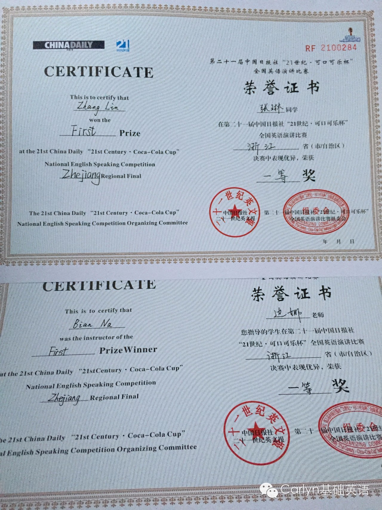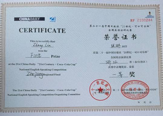 我校张琳同学在比赛的各个环节均发挥稳定,表现优秀。无论定题演讲、即兴演讲,还是回答问题,她都做到了表达清晰流畅,从容自信,最终荣获浙江赛区一等奖,这是我校学生迄今参加省级英语演讲比赛的最佳成绩。这一荣誉的取得离不开张琳同学个人良好的英语功底和勤奋努力,也离不开各位老师(喻锋平、张静、钱征宇、陈大为、鲁俊丰、边娜,及两位外教Marcus和Dave)的悉心指导,在此一并致谢,同时也希望我院学子来年再创辉煌!