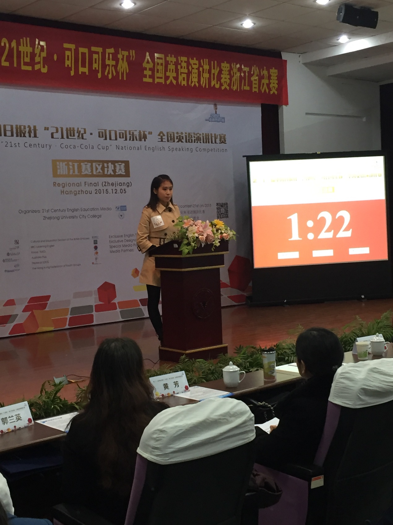第21届中国日报社“21世纪·可口可乐杯”全国英语演讲比赛浙江赛区决赛由浙江大学城市学院主办,来自全省高校的36名选手参赛。此次大赛设冠、亚、季军各1名,获得晋级全国半决赛资格;另有一等奖6名,二等奖10名,三等奖17名。