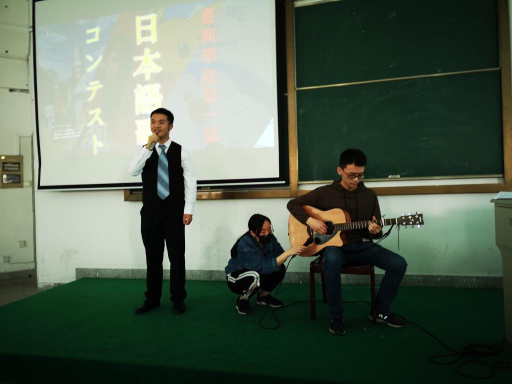 日语181、182班的张锦超和施国豪吉他伴奏演唱的一曲『みどり』启动了比赛,欢快的节奏和高亢的歌声回响在比赛现场,调动了接下来参赛同学们的歌唱情绪,也拨动了评委老师们的每一个神经。接下来,日语172班的叶林靓怡、姜雨灵、徐佳莹、张洁带来了小合唱『365日の紙飛行機』,歌唱友谊,表达了真切的同学感情;电信171班的徐劲涛的『恋愛循環』,俏皮可爱,充满了青春的正能量。其后,『僕が死のうと思ったのは』、『恋愛循環』、『サライ』等歌曲悉数登场,全场掌声不息,高潮迭起。意犹未尽的同学们请评委老师们也一展歌喉,最后,外教金崎老师代表靓丽登场,她的歌声拉近了师生间的距离,也将比赛推向了最高潮。