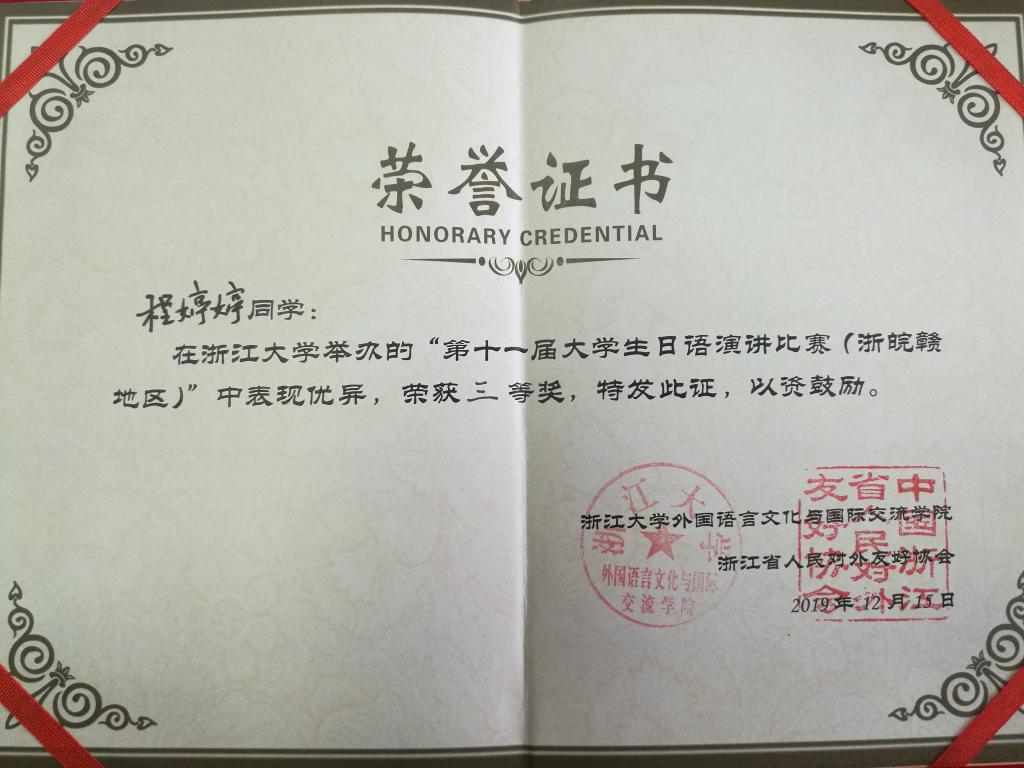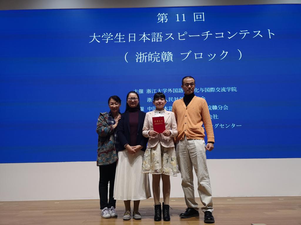 在33名选手的激烈角逐中,在刘韵超和外教桥川夫妻三位老师的细心指导下,我院日语专业学子程婷婷同学过关斩将,晋级决赛。在决赛的22名选手中,程婷婷同学的“命题演讲”题目是『あなたは、あなたであればいい』(“做你自己”),讲述了她留学日本秋田大学时的一个小故事。故事虽小,但使她从中获取了挑战困难的极大勇气。故事娓娓动听,拨动了听众和评委老师们的情感琴弦,感人至深。在接下来的“即兴演讲”和“回答问题”阶段,程婷婷同学沉着冷静。尤在“回答问题”环节中,她思维敏捷,条理清晰,对答如流,获得了在场听众的阵阵欢笑和热烈的掌声。最终,她与宁波大学、浙江工业大学、江西师范大学和浙江同人漫画 等高校的选手收获了三等奖。