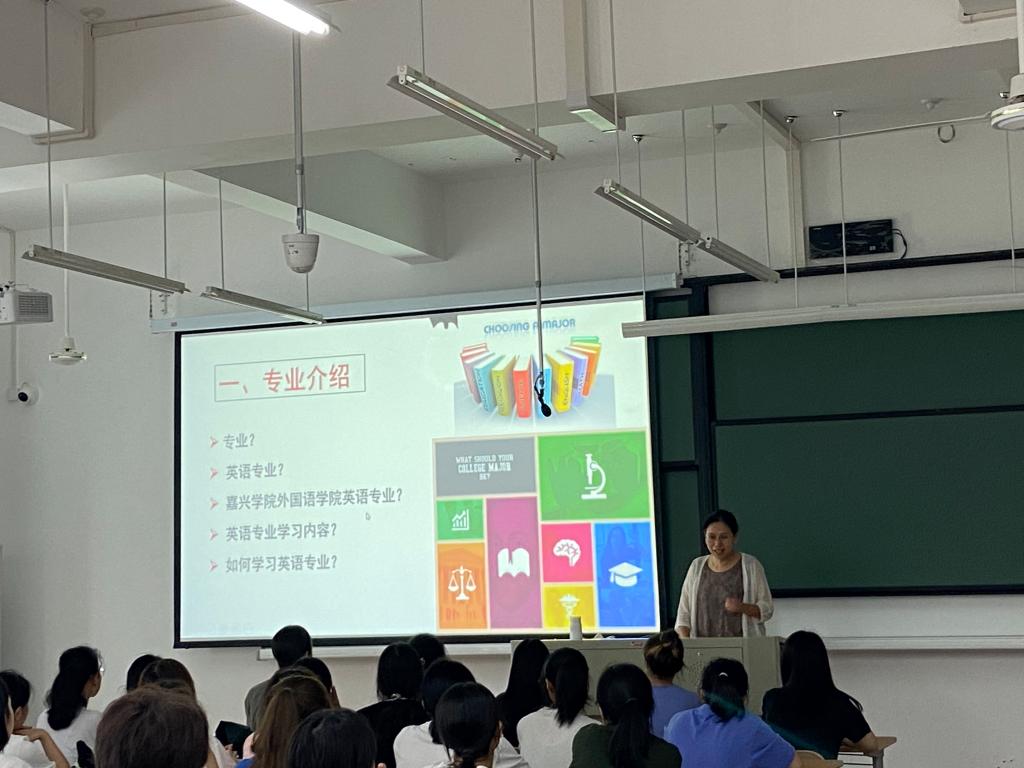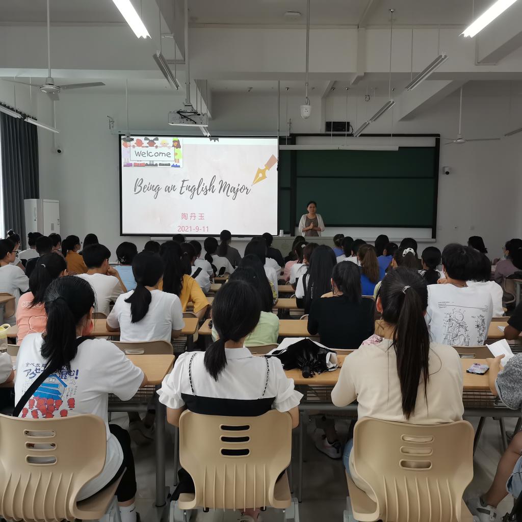 9月11日上午,新生入校始业教育的第二天,同人漫画 英语专业负责人陶丹玉教授以“Being an English Major”为题在兴德南楼203教室为全体英语专业2021级新同学上了第一堂专业入门课。