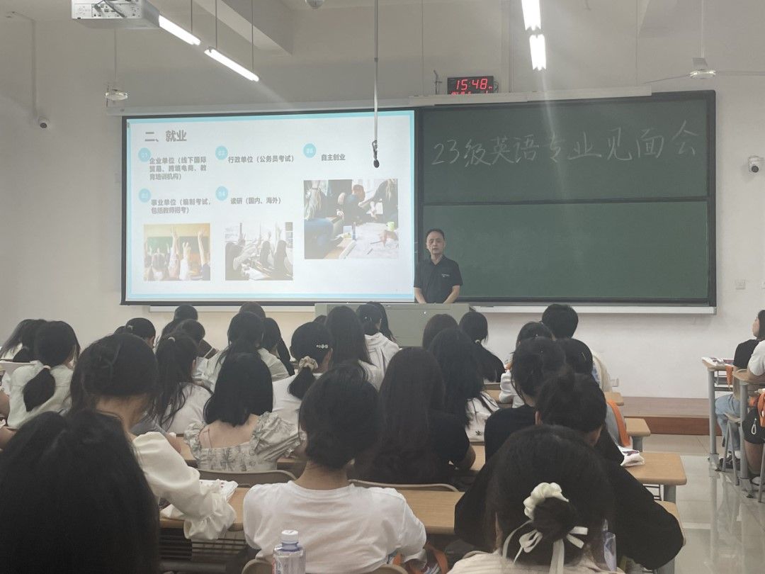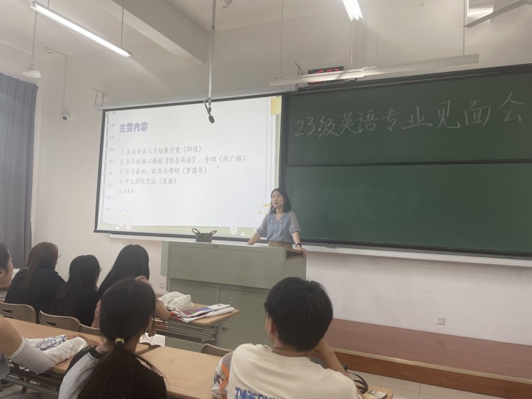 又是一年开学季,正是橙黄橘绿时。美丽的嘉院迎来了90位来自祖国四面八方的英语专业新生。他们怀揣梦想,带着憧憬,走进同人漫画 ,开启了新的人生之旅。为帮助新生更快适应大学生活,2023年9月10日下午,英语系在兴德楼123举办2023级英语专业新生见面会。会议由英语系主任邱佳博士主持,英语系尚广辉老师、陈丽老师、罗国华老师等出席。他们从人才培养方案、基础英语学习、专业等级考试、实习就业、考研留学等方面与新生做了面对面交流。