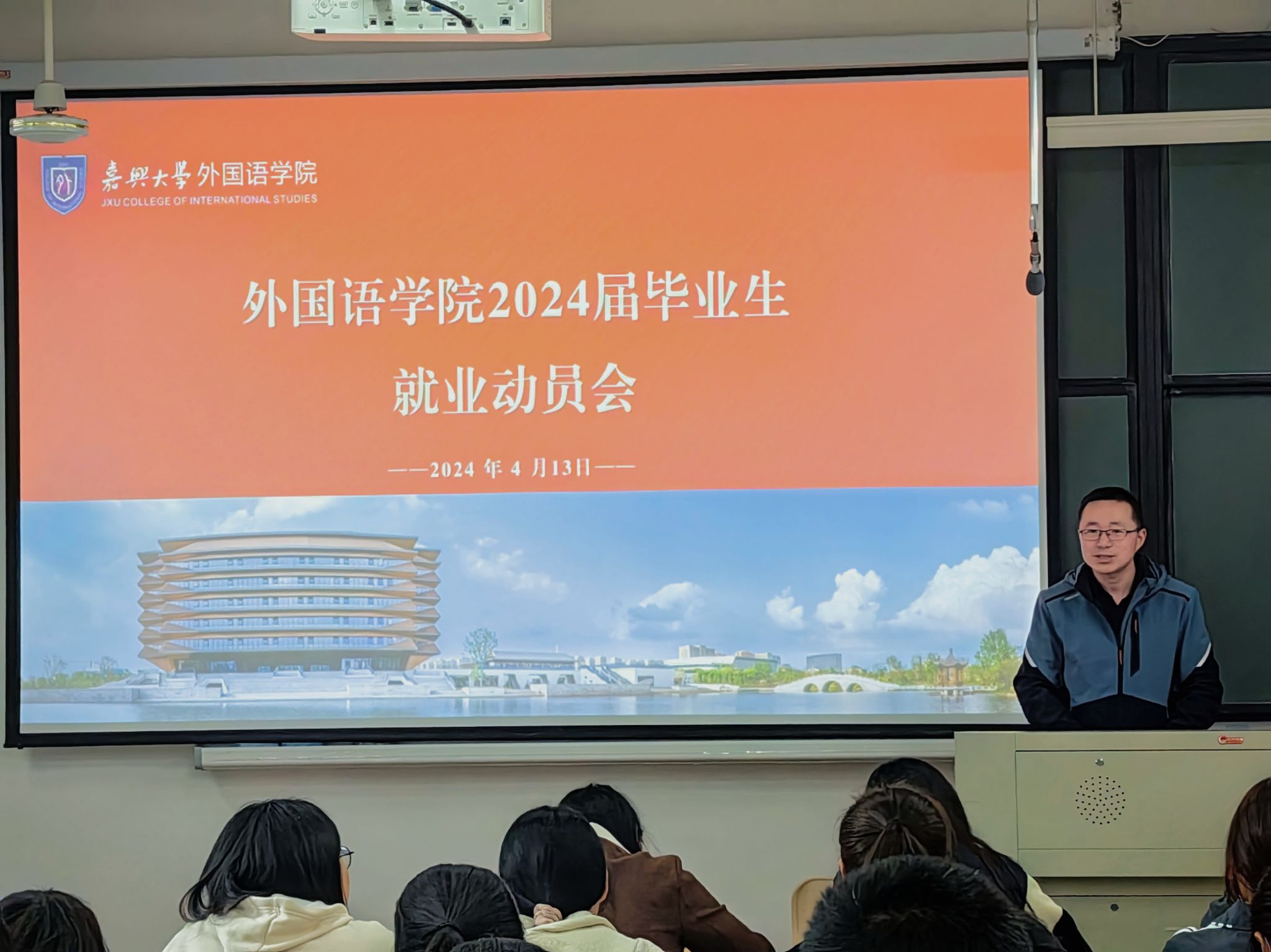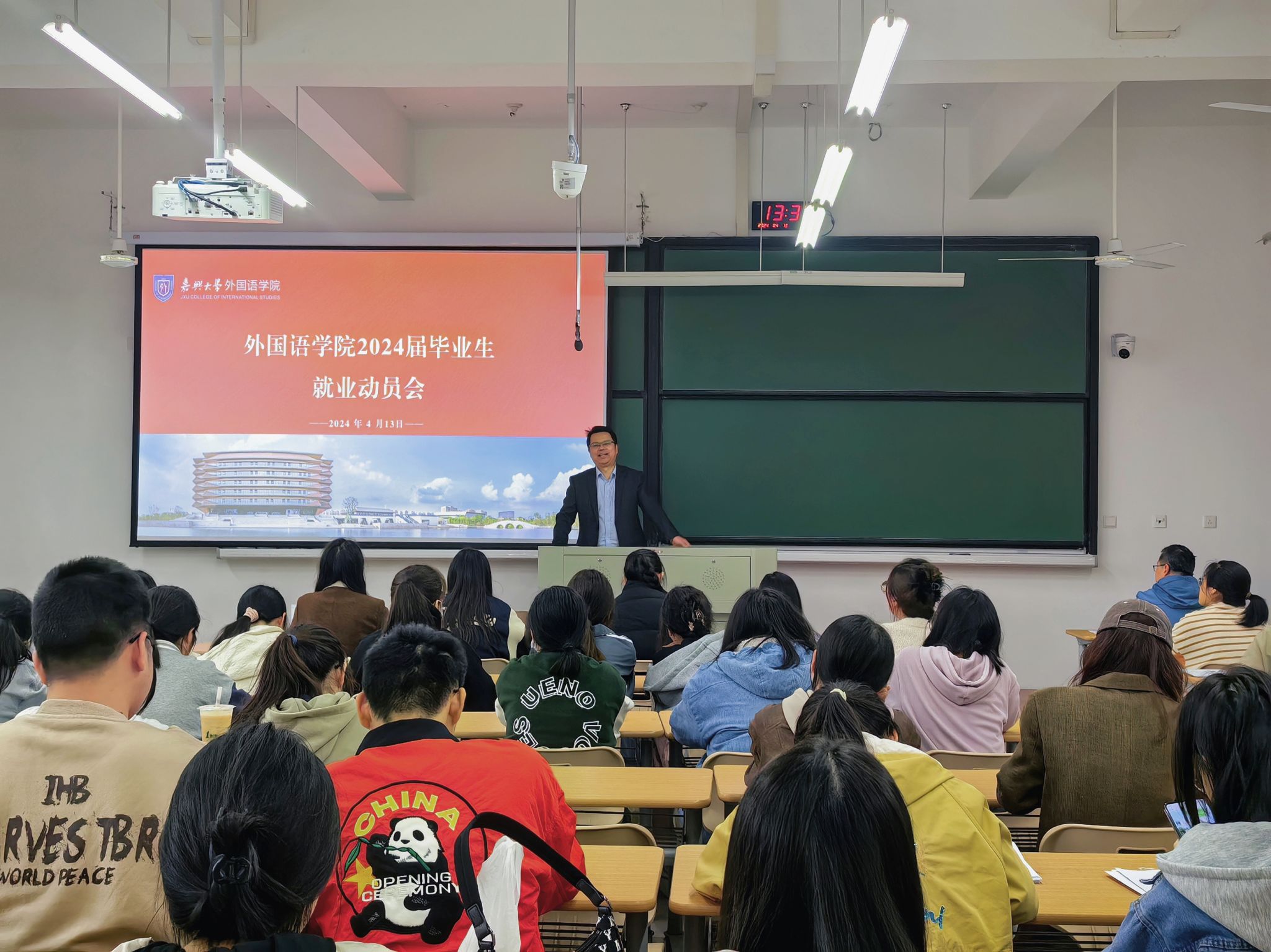 英语系副主任潘宁宇与就业辅导员胡笳丽为毕业生讲解毕业论文安排与分析当前就业形势,并建议要明确自身定位,合理规划个人职业发展路径。