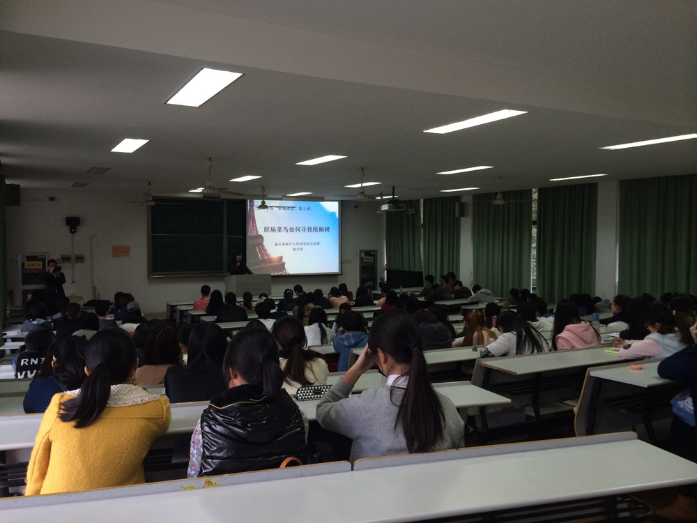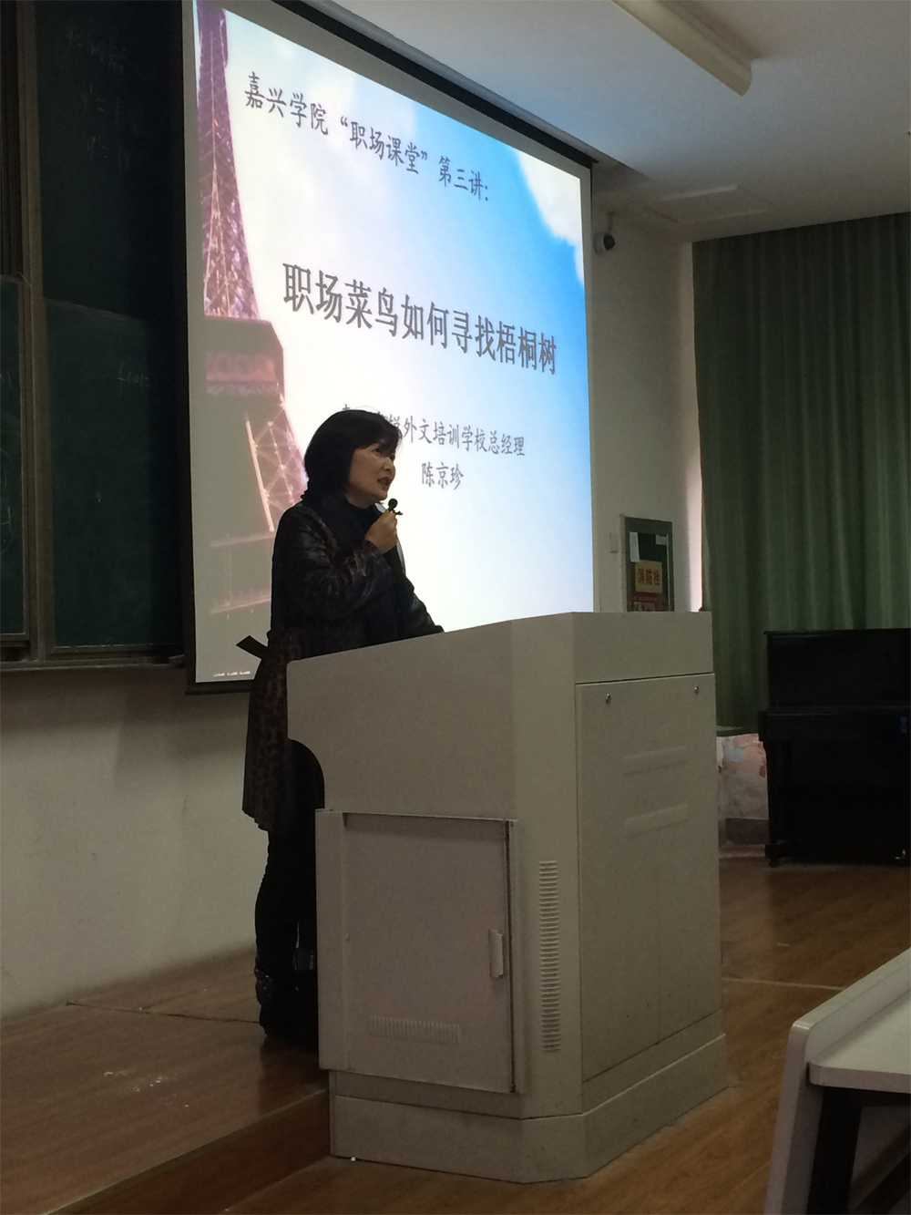 11月27日下午3:30分,由同人漫画 承办的嘉兴学院“职场课堂”第三讲在教二A225举行。此次“职场课堂”邀请到了嘉兴市海锐外文培训学校总经理陈京珍主讲。
