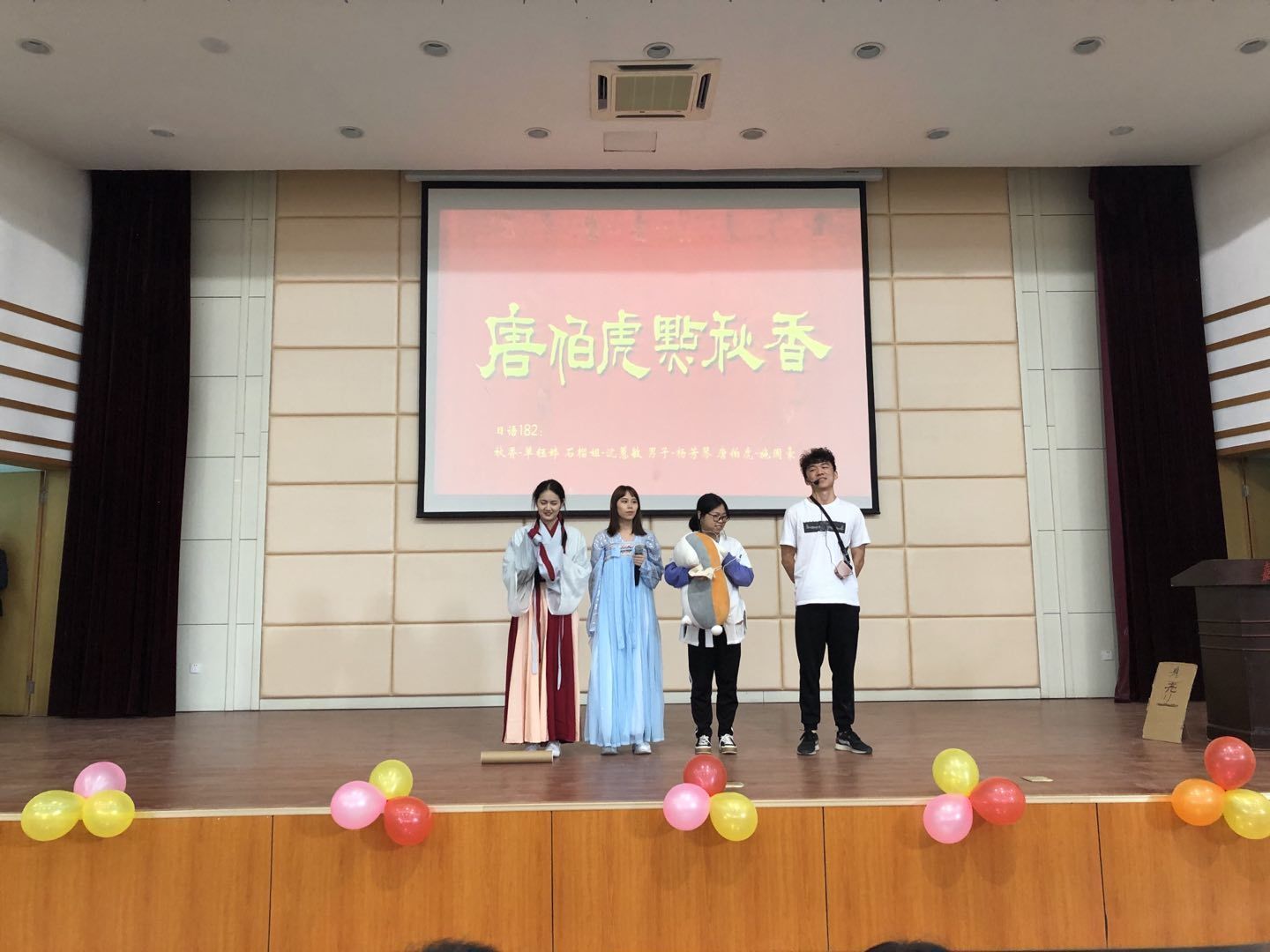 施国豪、杨芳琴、沈蕙敏、单钰婷小组的《唐伯虎点秋香》改编自周星驰的同名电影,他们熟练自如的日语表达征服了评委,幽默诙谐的表演使现场观众笑声不断,最终他们将一等奖收入囊中。