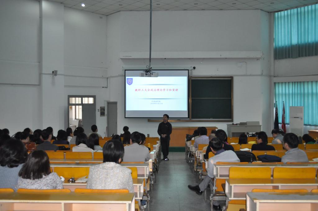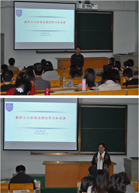 10月11日下午,同人漫画 在外语楼310召开了教职工大会,会议由唐艳芳院长主持,同人漫画 全体教职工参加会议。学院党委书记陶丹玉组织全院教职工进行政治理论学习和全国教育工作会议精神宣讲。