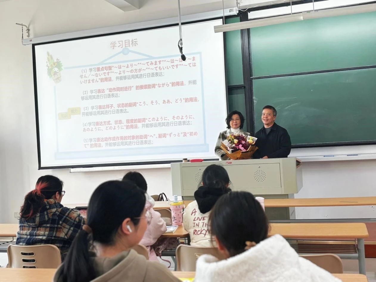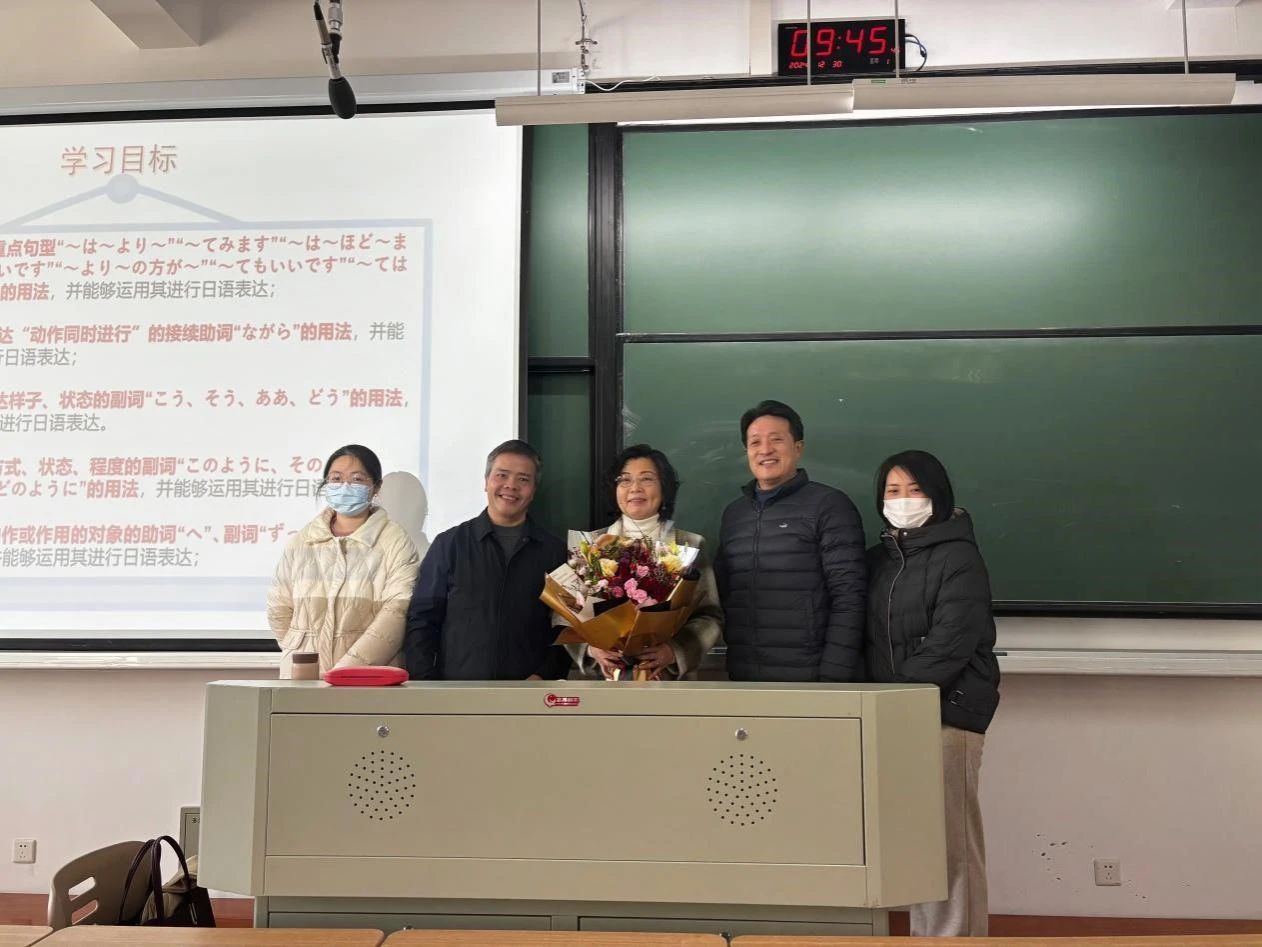 上课铃声准时响起,教室里坐满了全神贯注的学生。就在裴老师准备开始授课时,外院院长唐艳芳、日语专业建设负责人郭永恩、外院教工第三党支部书记陈陆琴、日语系副主任张艳琴,手捧鲜花走进了教室。唐艳芳院长代表学院领导班子发表了热情洋溢且满含深情的讲话,对裴老师在外院工作期间的辛苦付出表示衷心感谢,同时也表达了对裴老师退休后生活的美好祝福。瞬间,教室里响起了热烈的掌声,这掌声饱含着同学们的激动,更传递着大家对老师深深的感激之情。相信对于即将退休的裴艳霞老师,今天的课一定是任教以来最温暖的一堂课。