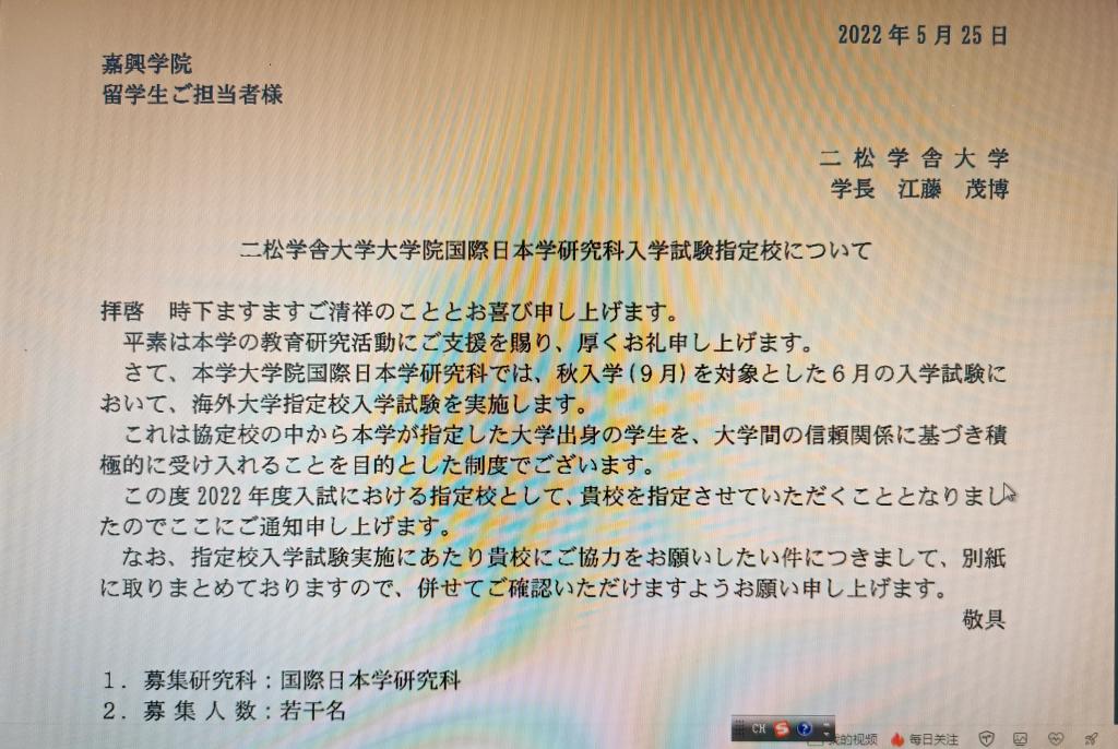 在学校国际交流处的大力支持下,我院日语专业与日本二松学舍大学建立了稳定的国际交流关系。鉴于多年来与日本二松学舍大学3+1项目顺利实施,今年,日本二松学舍大学将我校确定为二松学舍大学国际日本学专业硕士研究生推荐校,希望录用我校优秀日语专业毕业生赴日读研。今年2月和6月,我校日语专业组织了4名毕业生参加日本二松学舍大学硕士研究生考试,考试时间、内容和录用通知与日本国内同步进行。6月17日,我校日语专业4名毕业生均以优异的成绩通过了日本二松学舍大学硕士考试,被日本二松学舍大学录取为国际日本学专业的硕士研究生,录取率为100%。