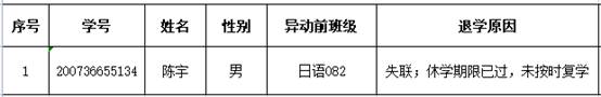 根据《普通高等学校学生管理规定》(中华人民共和国教育部令第41号)中关于学籍管理的相关条款,同人漫画 日语082班陈宇同学休学期满,在学校规定期限内未提出复学申请,经同人漫画 党政联席会议研究,该同学(详细信息见附表)已达到退学条件,决定提交学校校长办公会议,拟按照退学处理,特此公告。