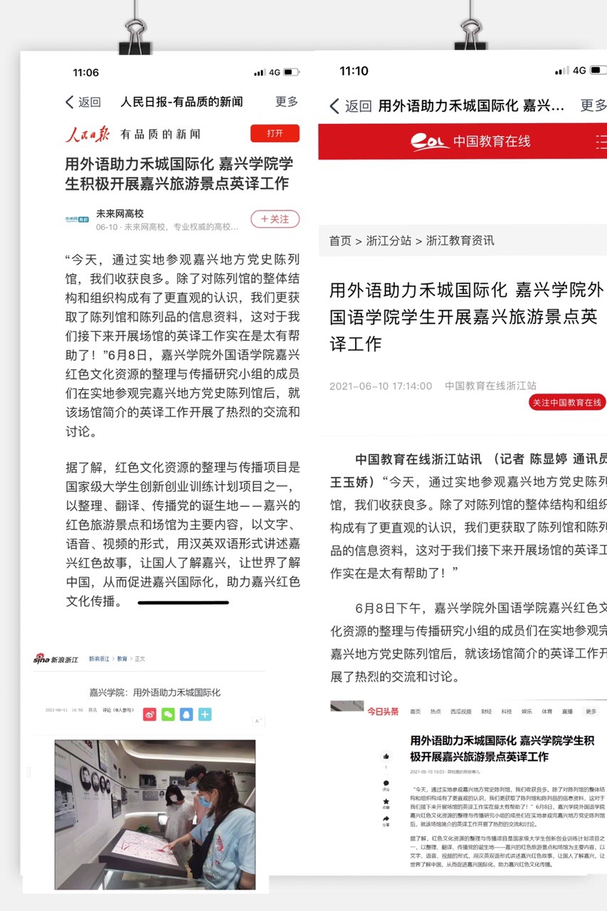 近日,我院学子从事的嘉兴红色文化资源译介工作被《人民日报》新媒体客户端、中国教育在线、新浪网、今日头条、嘉兴电视台禾点点、读嘉、嘉兴在线等多家媒体报道。