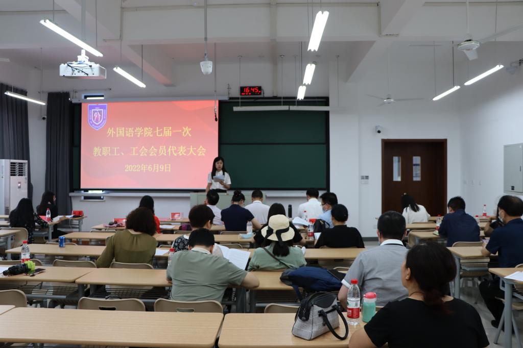 大会听取院长唐艳芳作的《迎难而上 再创辉煌 在新的发展阶段书写外语人最美华章》学院工作报告。学院工作报告全面回顾总结了学院2018年以来办学所取得的成绩,科学分析了当前学院发展面临的新形势、新机遇和新挑战,明确指出了学院下一阶段的奋斗目标与工作任务,严谨务实、客观全面、令人振奋,对于激发广大教职工以更加坚定的信心、更加饱满的热情、更加务实的举措,对实现学院教育事业全面发展具有重要意义。
