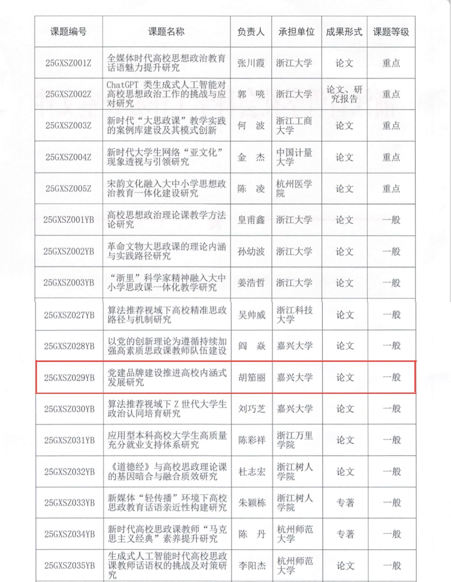 近日,浙江省哲学社会科学工作办公室公布了《关于公布2025年度浙江省哲学社会科学规划“高校思想政治工作研究”专项课题立项名单的通知》。同人漫画 学工办主任胡笳丽主持的课题《党建品牌建设推进高校内涵式发展研究》获得立项。该课题拟梳理目前高校(以江苏、上海、浙江等地的部分高校为调研对象)党建品牌建设情况的最新资料,了解目前高校党建品牌建设推动内涵式发展现状,分析存在的问题,为党建品牌建设推进高校内涵式发展提供可行的建议,为推进高校党建工作提供理论依据与实践指导。